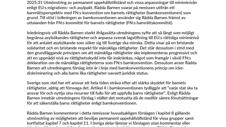 Rädda Barnen har svarat på remiss av delbetänkandet Utmönstring av permanent uppehållstillstånd och vissa anpassningar till miniminivån enligt EU:s migrations- och asylpakt, SOU 2025:31. Syftet med utredningen är att så långt som möjligt begränsa asylsökandes rättigheter och anpassa svensk lagstiftning till EU:s rättsliga miniminivå för att antalet asylsökande som söker sig till Sverige ska minska. Ett av förslagen är att utmönstra d.v.s. fasa ut, möjligheten att få permanent uppehållstillstånd, något som Rädda Barnen tydligt avstyrker.